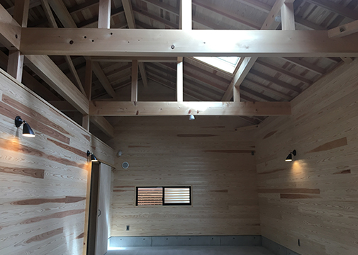 どの用にでも使える様に、広い面積と高さを意識した空間。 ひとまずは、お父さんのDIY作業場所。 物入の上部には、床を敷けるように梁をかけているので、ゆくゆくは子供たちの隠れ家にも。 居心地の良さを考えた小屋は、 トップライトからの陽りと、天竜杉の壁に囲われ 何をしても快適な場所。 自然乾燥の構造材は、艶やかにずっとそこに。